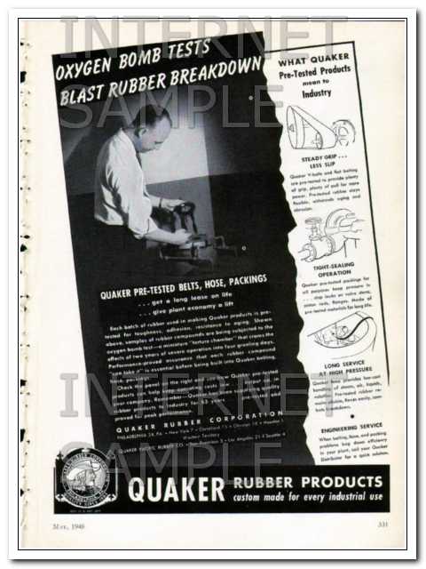 Original vintage industrial magazine ad for QUAKER RUBBER CORPORATION of Philadelphia, PA. Oxygen Bomb Tests Blast Rubber Breakdown. Quaker Pre-Tested Belts, Hose, Packings. Old 1948 industry advertisement. Would display magnificently matted and framed!