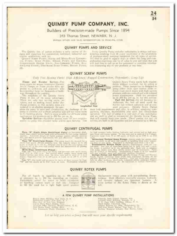 Manufacturers of Precision-made Pumps. Products include Screw Pumps used for House and Booster Service, Sprinkler Service and Fuel Oil Service. Quimby Rotex Pumps, Centrafugal Pumps type S Single Stage Centrifugal Pump, type G Centrifugal Pump, type M & L Multi-stage Centrifugal Pumps, Submerged Vertical Sump Pumps, Condensation Return Units, Sewage Pumps and Ejectors are all featured. Has numerous product images with detailed descriptions, illustrations, applications, specifications and dimensions provided. Unbound from a large 1935 architectural product catalog, this unique old one-page brochure would display beautifully matted and framed. Nice graphics. A fantastic addition to your vintage construction materials library.