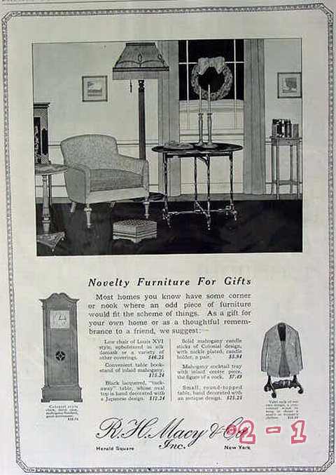 Original vintage magazine ad, R. H. MACY AND COMPANY, INC. "Novelty Furniture for Gifts" Features Louis XVI chair, table book stand of inlaid mahogany, solid mahogany candle sticks of Colonial design, Mahogany cocktail tray, colonial style clock, valet rack. Would look sensational matted and framed! Old 1919 Macy's furniture advertisement.