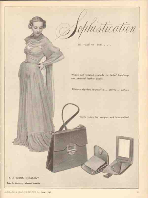 Original leather goods trade magazine vintage ad for R. J. WIDEN COMPANY. Main office and plant was located in North Adams, MA. Manufacturers of handbags. Sophistication in Leather too. Widen calf finished cowhide for ladies handbags and personal leather goods. This unique 1950 old leather industry magazine advertisement would display wonderful matted and framed. Nice graphics.