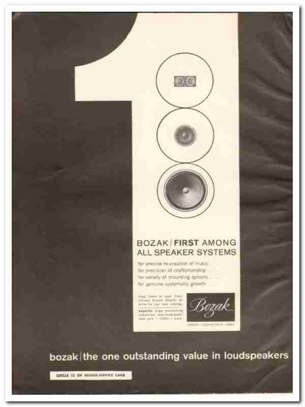 Original vintage ad for R. T. BOZAK COMPANY. First precise stereo speaker system, the one outstanding value in loudspeakers. Precision craftsmanship, variety of mounting options and genuine systematic growth. Hear them at your Franchised Dealer.