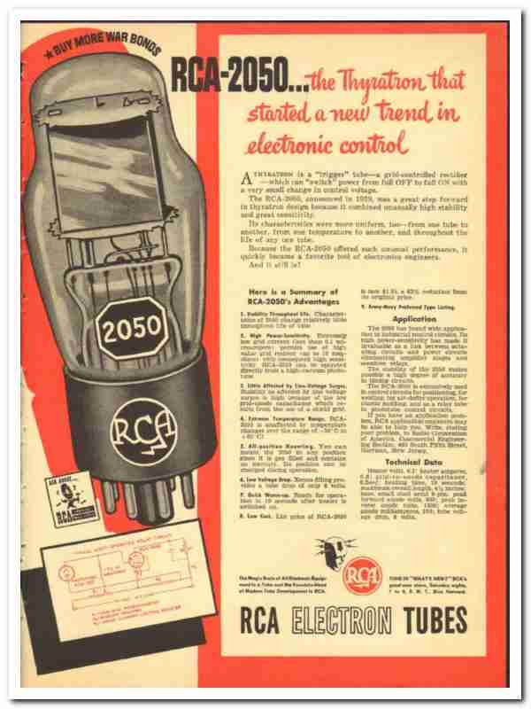 A Thyratron is a "trigger" tube - a grid-controlled rectifier, which can "switch" power from full OFF to full ON with a very small change in control voltage. The RCA-2050, announced in 1939, was a great step forward in Thyratron design because it combined unusually high stability and great sensitivity.