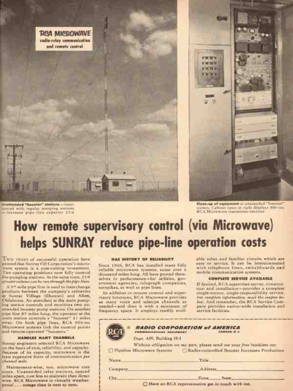 Original vintage oil and gas trade magazine ad for RADIO CORPORATION OF AMERICA of Camden, NJ. How Remote Supervisory Control via Microwave Helps Sunray Reduce Pipe Line Operation Costs. Handles many channels, history of reliability. Old 1954 petroleum industry oilfield and refinery advertisement.