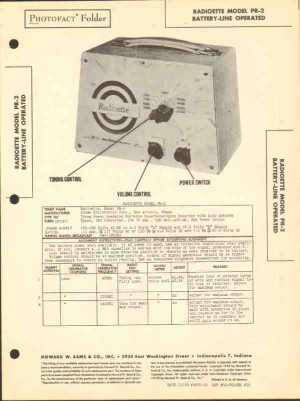 Vintage RADIOETTE model PR-2 portable 4 tube Superheterodyne AM radio receiver. Original old Sams Photofact manual includes schematic, layouts, alignment info, repair parts list. 4 pages. Dated 1948. Alamo Electronics Corp., of San Antonio, TX. This manual would make a sensational accompaniment to your vintage audio equipment.