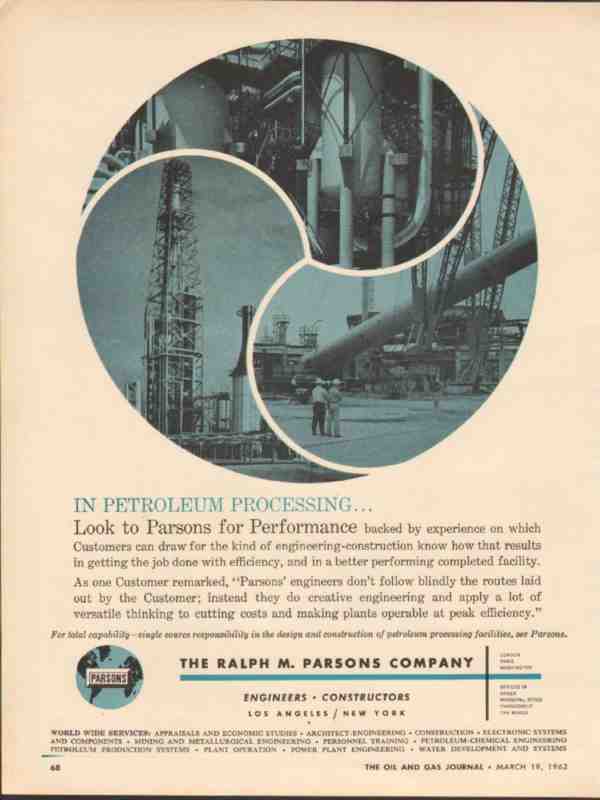 Original oil and gas trade magazine vintage ad for THE RALPH M. PARSONS COMPANY of Los Angeles, CA. In Petroleum Processing Look to Parsons for Performance Backed by Experience on Which Customers can Draw for the Kind of Engineering Construction Know How That Results in Getting the Job Done with Efficiency, and in a Better Performing Completed facility. This unique old 1962 petroleum process refining industry equipment and construction magazine advertisement would display beautifully matted and framed.