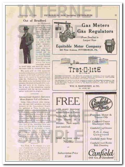 On the reverse side (see Additional Images tab) are multiple page ads for EQUITABLE METER COMPANY of Pittsburgh, PA. Gas Meters Gas Regulators. W.M. S. BARNICKEL AND COMPANY of St. Louis, MO. Tret-O-Lite petroleum emulsions. CANFIELD OIL COMPANY of Cleveland, OH. Premium Motor & Tractor Oils.