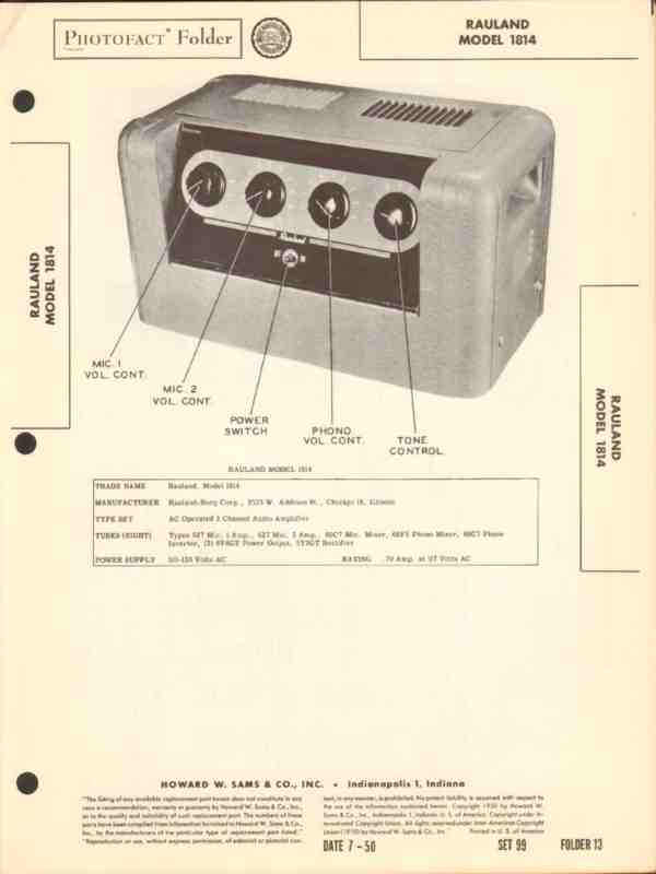 Vintage RAULAND model 1814 8 tube 3 channel audio amplifier. Original old Sams Photofact manual includes schematic, layouts, voltage test charts, repair parts list. 4 pages. Dated 1950. Rauland-Borg Corp., of Chicago, IL. This manual would make a sensational accompaniment to your vintage audio equipment.