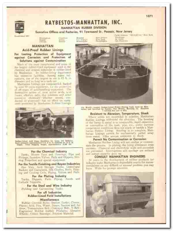 Products include Manhattan Acid-Proof Rubber Linings for Lasting Protection of Equipment against Corrosion and Protection of Solutions against Contamination.