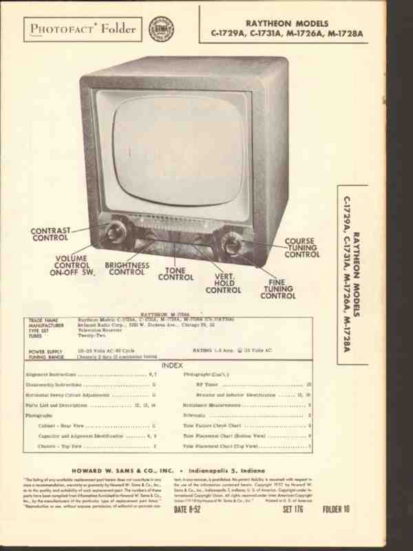 Vintage RAYTHEON model C-1729A, C-17231A, M-1726A and M-1728A 22 tube TV television receiver. Original old Sams Photofact manual includes schematic, layout, alignment instructions, voltage & resistance test chart, repair parts list. 16 pages. Dated 1952. Belmont Radio Corp., of Chicago, IL. This manual would make a sensational accompaniment to your classic video TV equipment.