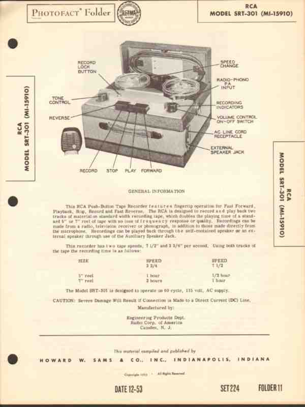 rca model srt-301 magnetic tape recorder sams photofact manual