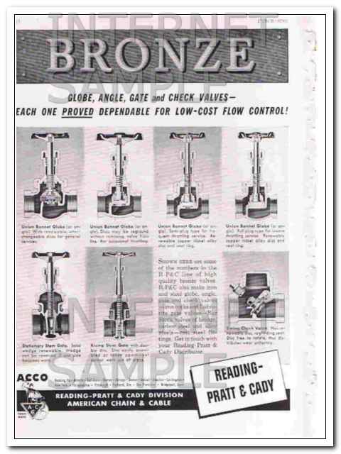 Original vintage industrial magazine ad, for READING-PRATT AND CADY American Chain and Cable. Bronze Glove, Angle, Gate and Check Valves, Each One Proved Dependable for Low-Cost Flow Control! Old 1948 tool industry advertisement. (The scan shows a slight pink tint that is not on the actual ad.)