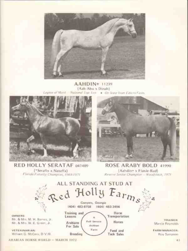 Original old equestrian trade magazine vintage ad for RED HOLLY FARMS in Conyers, GA. Aahdin 11239, sire Aah-Abu, dam Dinah, photographed by Polly Knoll. Legion of Merit, National Top Ten, on lease from Edicro Farm. Also shown is Red Holly Serataf 047409, sire Serafix, dam Nataffa, photographed by Johnny Johnston, and Rose Araby Bold 41990, sire Aahdin, dam Flazie-Rad, photographed by Harold Campton. Owners Mr and Mrs M. H. Barnes,Jr., Mr and Mrs W.E. Green, Jr. Veterinarian William G. McCary, Trainer Marcia Reynolds, farm manager Roy Sampson. This unique 1972 equine advertisement would display beautifully matted and framed.