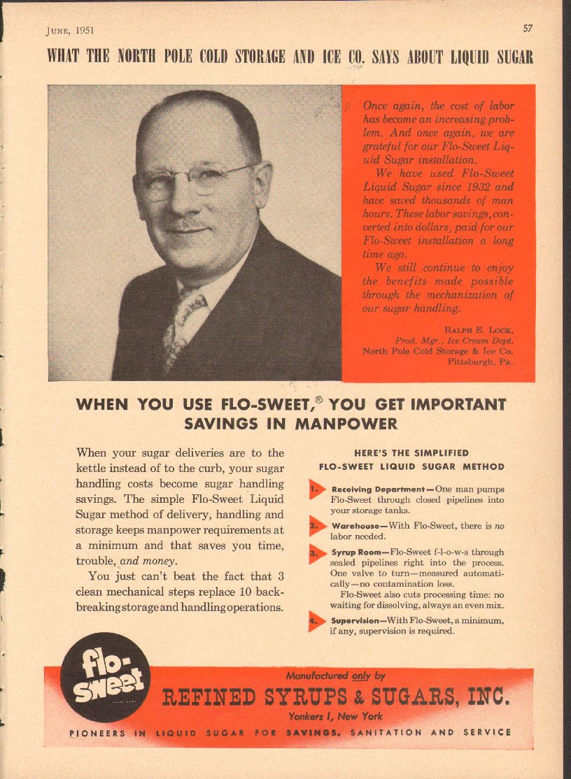 Original ice cream trade magazine vintage ad for REFINED SYRUPS & SUGARS, INC. Main office and plant was located in Yonkers, NY. What the North Pole Cold Storage & Ice Company, of Pittsburgh, PA. Pictured is Mr Ralph E. Lock, Product Manager, Ice Cream Department, Says About Flo-Sweet Liquid Sugar, When you use Flo-Sweet, you get important savings in manpower. This unique 1951 old dairy industry magazine advertisement would display wonderful matted and framed. Nice graphics.