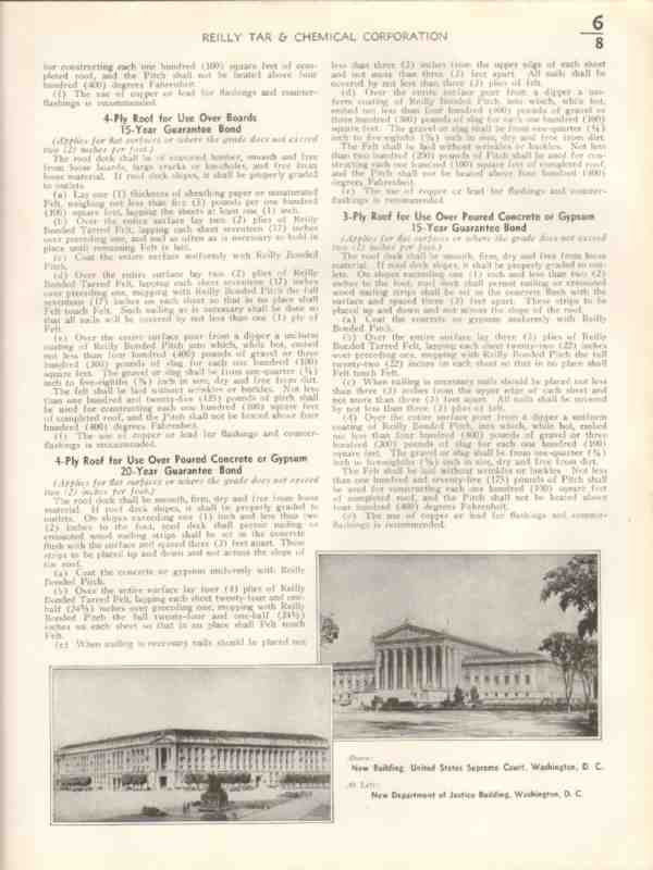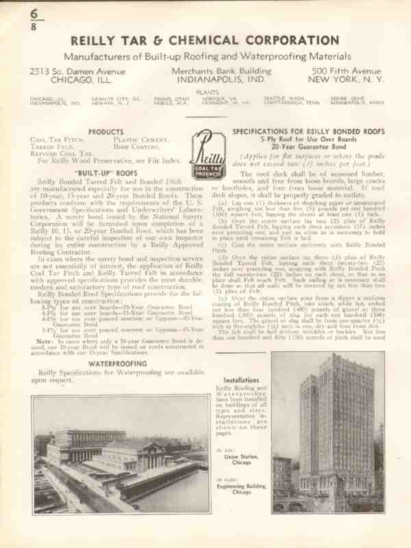 Original roofing trade vintage catalog for REILLY TAR & CHEMICAL CORPORATION. Factory was located at 2513 South Damen Street, Chicago, IL. Sales office was located at 500 Fifth Avenue, New York City, NY and in the Merchants Bank Building, Indianapolis, IN. Roofing, Waterproofing. Built-Up Roofs, Specifications for Reilly Bonded roofs. Used at Union Station, Chicago, United States Supreme Court, Washington, DC. Unbound from a large 1938 architectural catalog, this unique old two page technical brochure would display beautifully matted and framed. Nice graphics. A marvelous addition to your retro roofing construction library.