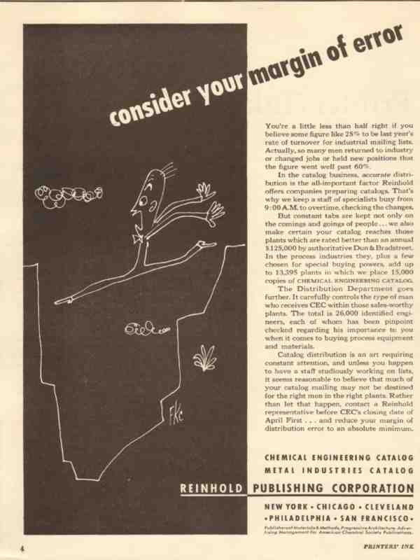 Original vintage media trade magazine ad for the REINHOLD PUBLISHING CORPORATION of New York City, Chicago, Cleveland, Philadelphia, and San Francisco. Consider Your Margin of Error. Chemical Engineering Catalog, Metal Industries Catalog. Art signed by FKC. Old 1947 magazine advertising industry advertisement, would display beautifully matted and framed.