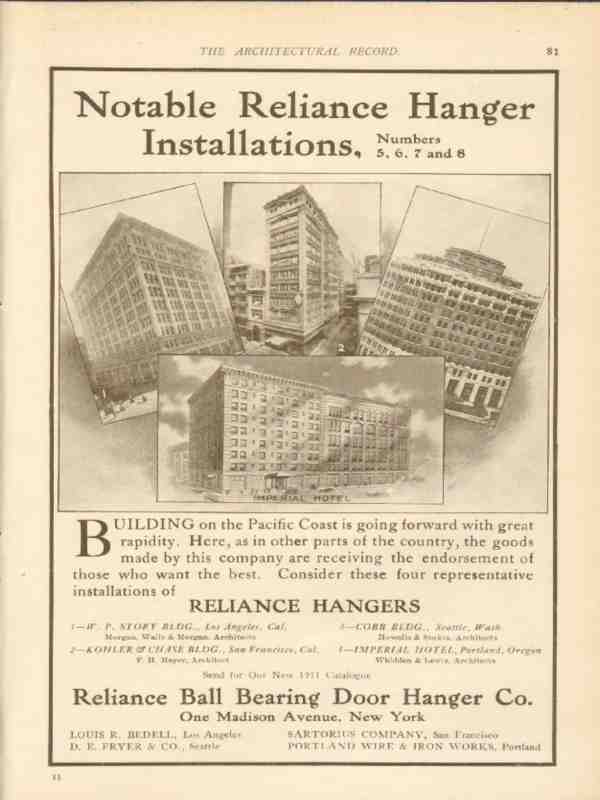 Original vintage architecture trade magazine ad for RELIANCE BALL BEARING DOOR HANGER COMPANY of New York City, NY. Notable Reliance Hanger Installations. The W.P. Story Building in Los Angeles, CA. Morgan, Walls and Morgan Architects. Kohler and Chase Building in San Francisco, CA. F.H. Meyer, Architect. Cobb Building, Seattle, WA. Howells and Stokes, Architects. Imperial Hotel, Portland, OR. Whidden and Lewis, Architects. Old 1911 building construction industry hardware advertisement.