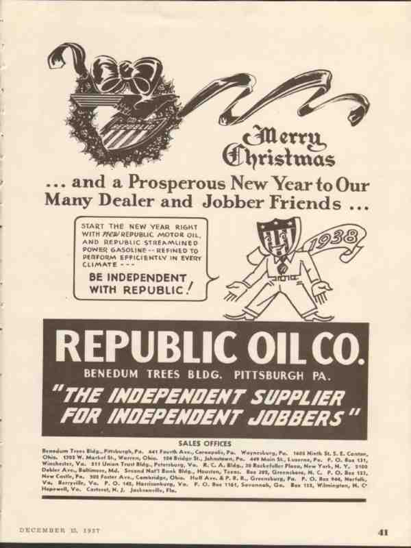 Original oil and gas trade magazine vintage ad for REPUBLIC OIL COMPANY, was located in the Benedum Trees Building, Pittsburgh, PA. Merry Christmas to Our Many Dealer and Jobber Friends. Start the New Year right with streamlined power gas, refined to perform efficiently in every climate. This unique 1937 old petroleum products and gasoline service station industry magazine advertisement would display beautifully matted and framed.