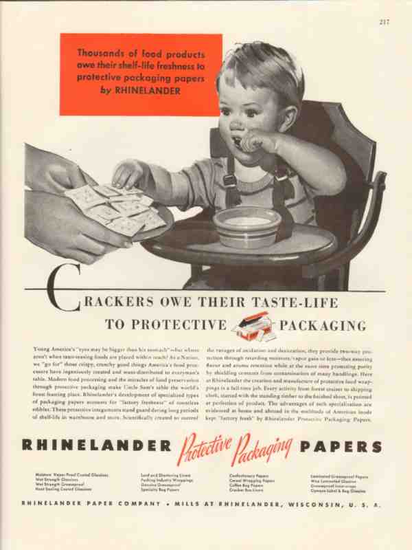 Original old industrial trade magazine ad for RHINELANDER PAPER COMPANY of Rhinelander, WI. Thousands of food products owe their shelf life freshness to protective packaging paper by Rhinelander. Crackers owe their taste life to protective packaging. This 1947 magazine advertisement would display beautifully matted and framed.