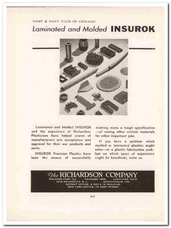 Original WW2 wartime plastics vintage ad for RICHARDSON COMPANY. Insurok molded and laminated plastic meet many tough specifications, saving other critical materials for other important jobs.