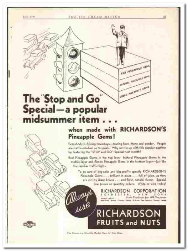 Manufacturers of Richardson Fruits and Nuts. 'The Stop and Go Special - a popular midsummer item, when made with Richardson Pineapple Gems'.