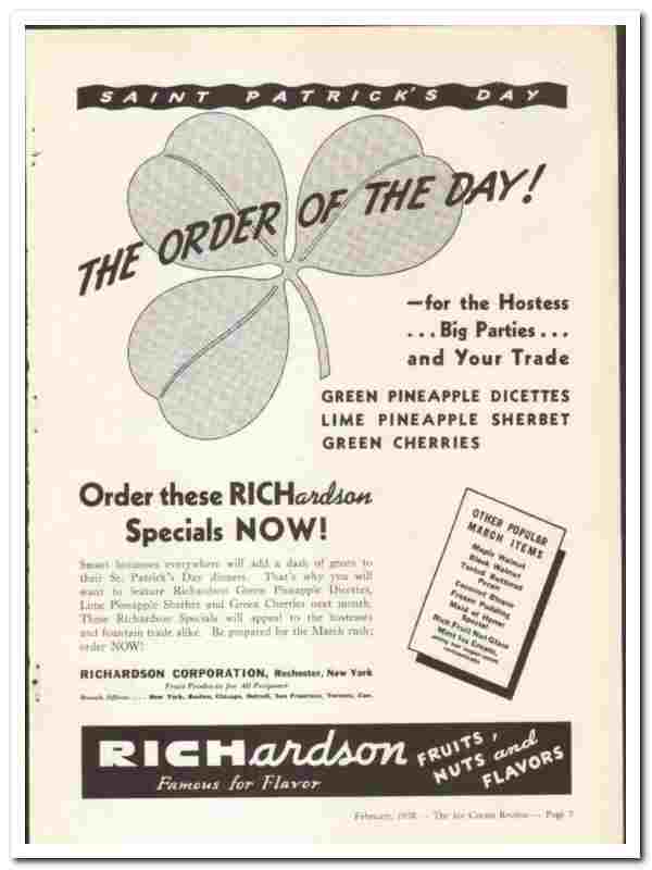 Richardson Corp 1938 vintage ice cream ad St Patricks Day order day