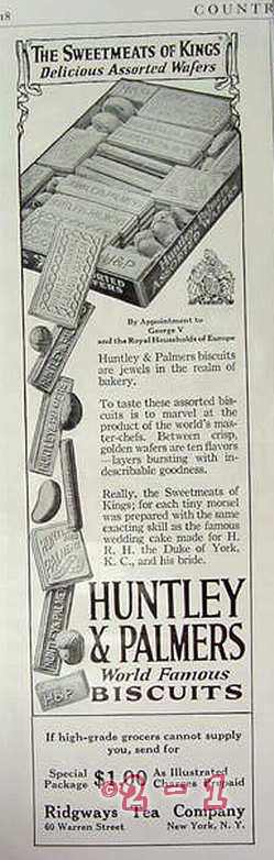 Original vintage magazine ad, RIDGWAYS TEA COMPANY, of New York City, NY. Huntley and Palmers World Famous Biscuits, The Sweetmeats of Kings. Old 1924 cookie advertisement.