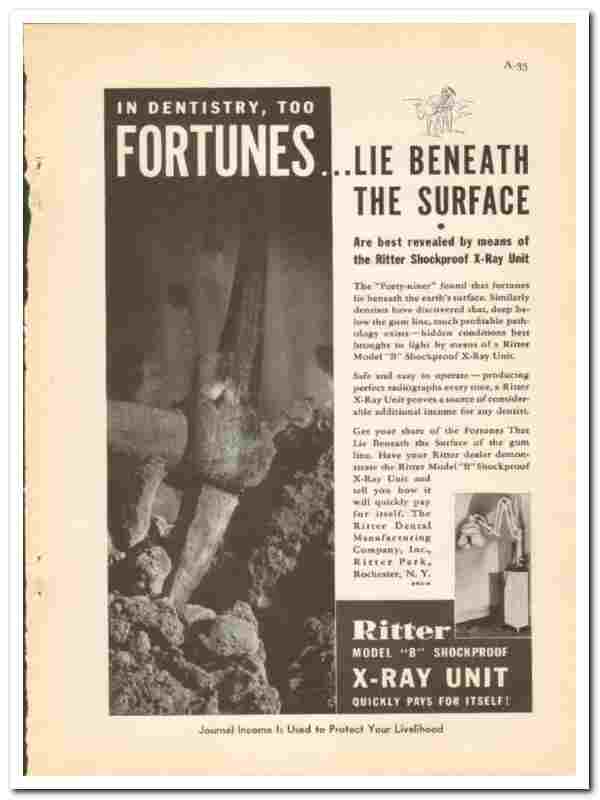 'In Dentistry, Too, Fortunes Lie Beneath the Surface.' Are best revealed by means of Ritter Shockproof X-Ray Unit. The 'Forty-Niner' found that fortunes lie beneath the earth's surface. Similarly dentists have discovered that, deep below the gum line, much profitable pathology exists; Hidden conditions best brought to light by means of a Ritter Model 'B' Shockproof X-Ray Unit. Safe and easy to operate; producing perfect radiographs every time, a Ritter X-Ray Unit proves a source of considerable additional income for any dentist. Get your share of the fortunes that lie beneath the surface of the gum line.
