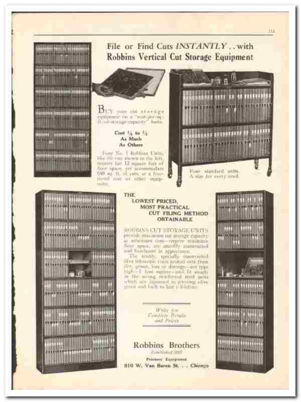 Manufacturers of Robbins Vertical Cut Storage Equipment. Printers Equipment.