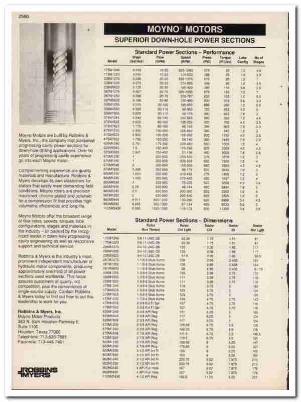 Manufacturers of Moyno Motors. Built by Robbins & Myers, the company that pioneered progressing cavity power sections for down-hole drilling applications. Broadest ranges of flow rates, speeds, torques, lobe configurations, stages and materials for the oilfield industry. Images, illustrations, descriptions, and specification charts provide extensive product details.