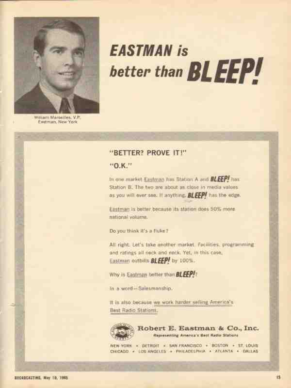 Original vintage broadcasting trade magazine ad for ROBERT E. EASTMAN AND COMPANY, INC. William Marseilles, VP. Eastman is Better Than Bleep! Representing America's Best Radio Stations. Old 1965 broadcasting industry advertisement.