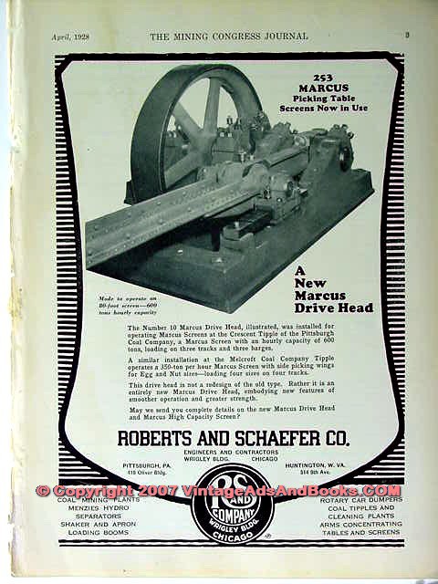 Original vintage mining magazine ad, ROBERTS AND SCHAEFER COMPANY of Chicago, IL. The Number 10 Marcus Drive Head was installed for operating Marcus Screens at the Crescent Tipple of the Pittsburgh Coal Company. A similar installation at the Melcroft Coal Company Tipple operates a 350-ton per hour Marcus Screen with side picking wings for Egg and Nut sizes. Old 1928 dated mining industry advertisement.