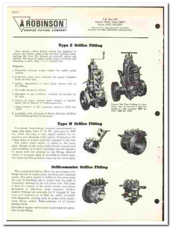 Original 1974 Oil and Gas trade vintage catalog for the ROBINSON ORIFICE FITTING COMPANY. (Division of Perry Equipment Corp). Main office and plant were located in Mineral Wells, TX.