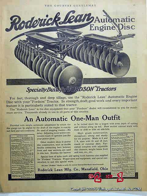 Original vintage magazine ad, RODERICK LEAN MANUFACTURING COMPANY., of Mansfield, OH. Roderick Lean Automatic Engine Disc, Specially built for Fordson Tractors. Old 1918 farm tractor advertisement. Would look fantastic matted and framed!