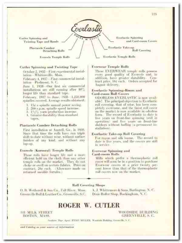 Original 1938 textile trade vintage ad for ROGER W CUTLER. Main office and plant was located at 141 Milk Street, Boston, MA. Was also located in the Woodside Building, Greenville, SC.