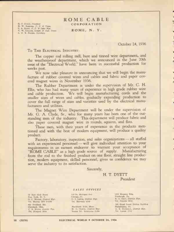 Original old electrical industry trade magazine ad for ROME CABLE CORPORATION of Rome, NY. H. T. Dyett, President of Rome Cable Corporation Open Letter to the Electrical Industry. Rubber Department under the supervision of Mr C.H. Ellis. Magnet Wire Department under the supervision of Mr G.A. Clyde, Sr. Beginning the manufacture of rubber covered wires and cables and fabric and paper covered magnet wires in November 1936. This 1936 industry magazine advertisement would display beautifully matted and framed.