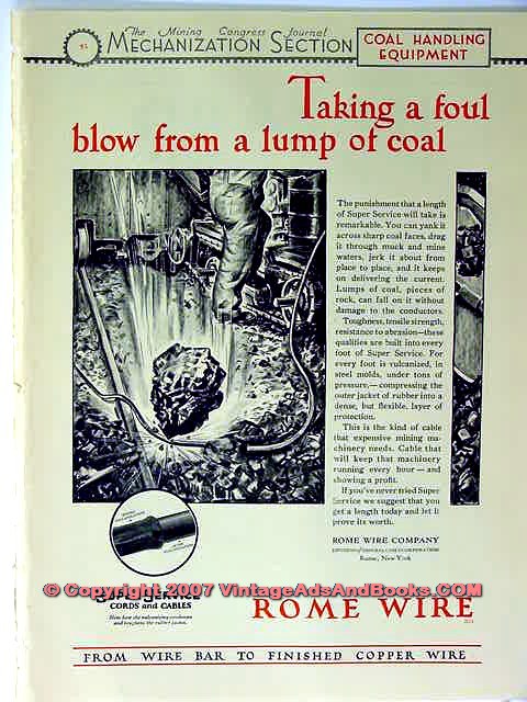 Original vintage mine magazine ad, ROME WIRE COMPANY, Division of General Cable Corporation, Rome, NY. Super Service Cords and Cables. Old 1928 coal mining tools and equipment advertisement. Would look fabulous matted and framed!