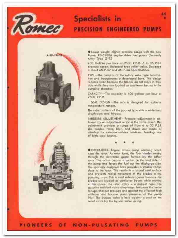 Manufacturers of Precision Engineered Pumps. Products include Hydraulic Pumps, Water Injection Pumps, Vacuum Instrument and De-Icer Pump, and Fuel Pumps. Has numerous product images with detailed descriptions, uses, applications, dimensions and specifications. Unbound from a large wartime 1945 engineering designer catalog, this unique old four page technical brochure would display beautifully matted and framed. Nice cover graphics. A fantastic addition to your vintage industrial equipment library.