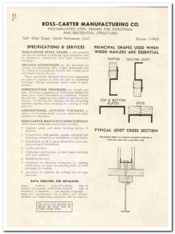 Ross-Carter Steel Frame is the practical and proven method of applying light structural steel to residential, commercial and light industrial buildings. Obvious advantages are the provisions for strong, non-shrinking, light weight, earthquake and fire resistant construction, termite and vermin proof and impervious to dry rot.
