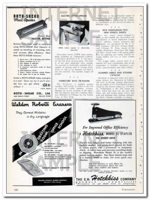 Original vintage industrial magazine ad ROTO-SHEAR COMPANY LTD of Dallas, TX. Roto-Shear mail Opener Opens Mail Faster, Better. Old 1948 fractional page industry advertisement. Would display magnificently matted and framed!