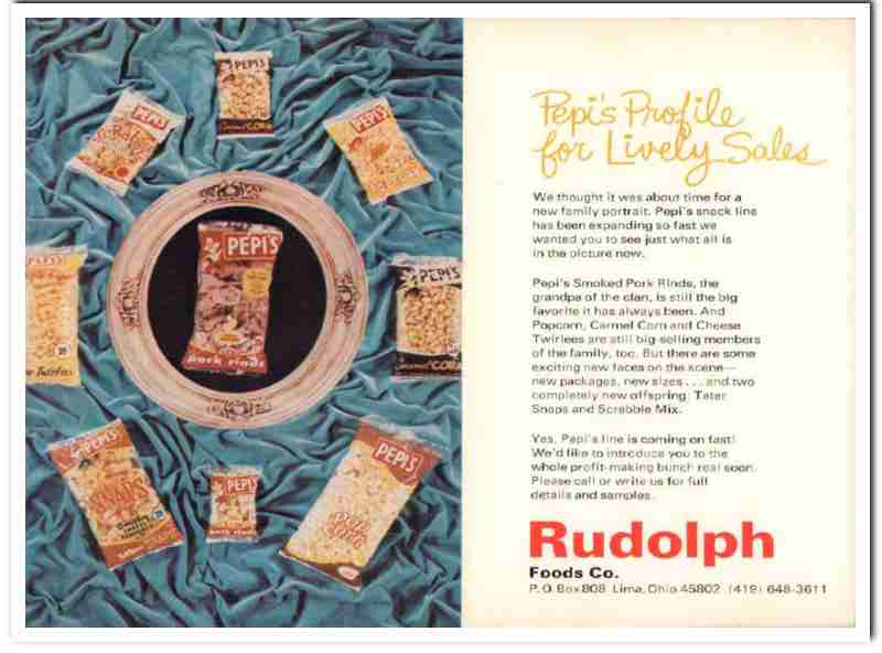 Original 1968 potato chip trade magazine vintage ad for the RUDOLPH FOODS COMPANY. Main office and factory was located in Lima, Ohio. Portrait of the growing Pepis family. Pepis Smoked Pork Rinds, the grandpa of the clan, is still the big favorite it has always been. Popcorn, Carmel Corn and Cheese Twirlees are still big-selling members of the family, too. New packages, new sizes and two completly new offspring, Tater Snaps and Scrabble Mix. This old two-sided snack food manufacturing advertisement would display beautifully matted and framed.