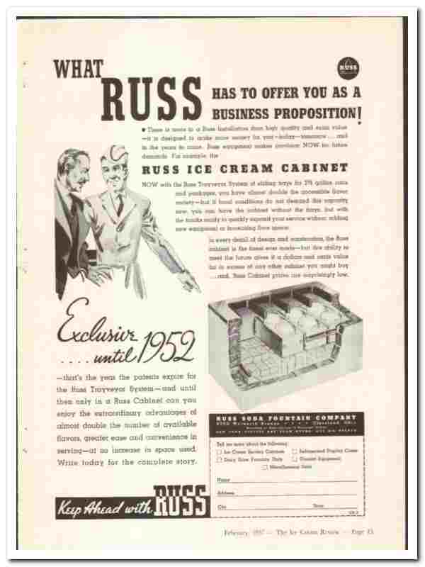Manufacturers of Russ Ice Cream Cabinets. 'What Russ has to Offer you as a Business Proposition'.