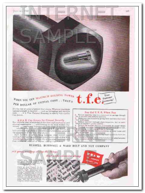 Original vintage industrial magazine ad, for RUSSELL BURDSALL AND WARD BOLT AND NUT COMPANY. When you Get Maximum Holding Power per Dollar of Initial Cost, That's TFE. True Fastener Economy! R B and W Cap Screws for Utmost Security. Old dated 1948 metal industry advertisement. (The scan shows a slight pink tint that is not on the actual ad.)