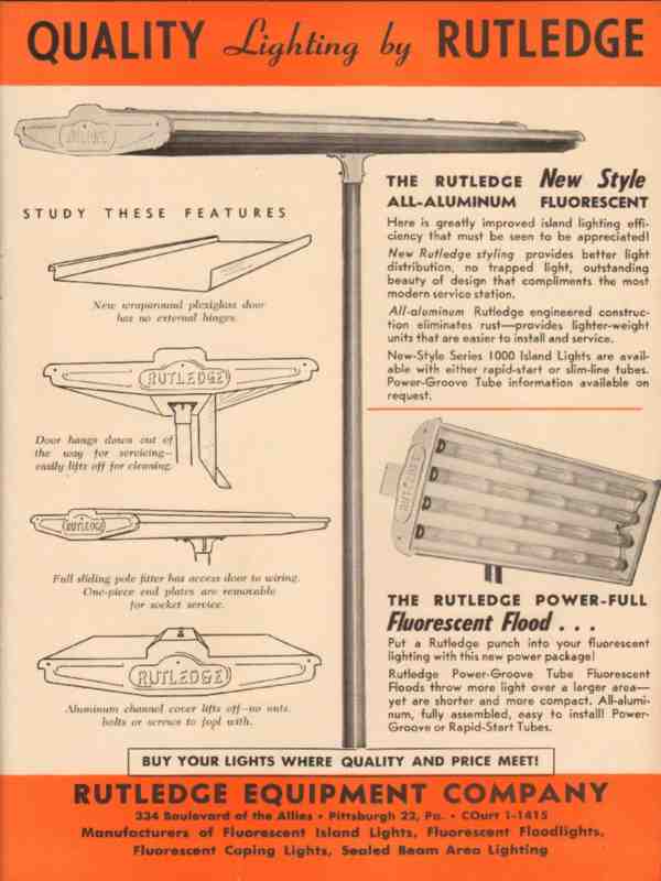 Original old service station trade magazine vintage ad for RUTLEDGE EQUIPMENT COMPANY of Pittsburgh, PA. Aluminum Fluorescent Light for Greatly Improved Island Lighting. This unique 1957 electrical lights advertisement would display beautifully matted and framed.
