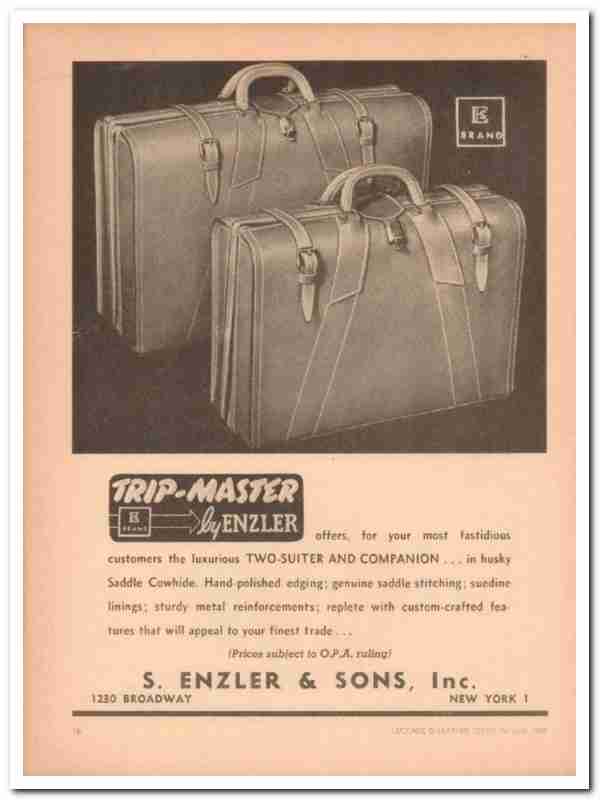 Original luggage trade magazine vintage ad for S. ENZLER & SONS, INC. Main office and plant was located at 1239 Broadway, New York City, NY. Manufacturers of luggage. Trip-Master, by Enzler, offers customers the luxurious Two-Suiter and Companion, in husky Saddle Cowhide. Hand-polished French edging, genuine saddle stitching, suedine linings, sturdy metal reinforcements, replete with custom-crafted features that will appeal to your finest trade! This unique 1946 old luggage industry magazine advertisement would display fantastic matted and framed. Nice graphics.