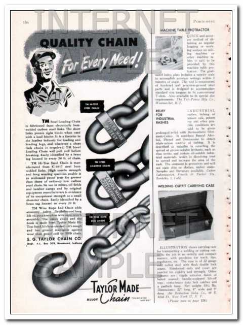 Original vintage industrial magazine ad, for S. G. TAYLOR CHAIN COMPANY of Hammond, IN. Quality Chain for Every Need! TM Hi-Test Steel chain, TM Steel Loading Chain, TM Wire End Chain. Old 1948 fractional page industry advertisement.