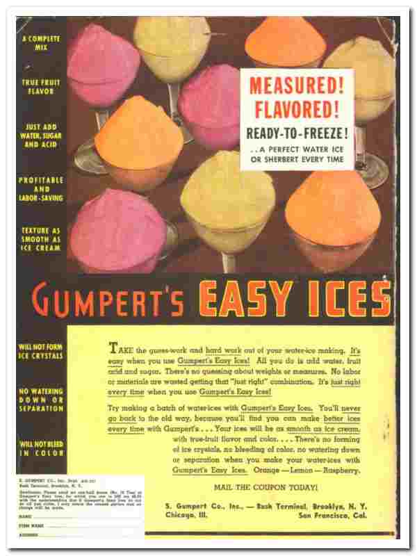 Manufacturers of Gumpert Easy Ices. 'Measured! Flavored! Ready-To-Freeze! A Perfect Water Ice or Sherbert Every Time'.
