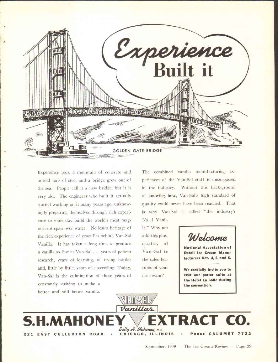 Original 1939 ice cream vintage magazine ad for the S. H. MAHONEY EXTRACT COMPANY. Main office and plant were located at 221 East Cullerton Road, Chicago, IL. (Sally H. Mahoney, President).