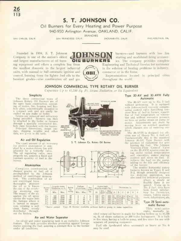Original heating trade vintage catalog for S. T. JOHNSON COMPANY, was located at 940-950 Arlington Avenue, Oakland, CA. Manufacturers of Rotary Oil Burner made for Heating Boiler. The Boiler-Burner Laddi Du-All Units set directly on the floor. Fully automatic, odorless, quiet and trouble free. Air-Conditioning Unit Selectair, Furnace Bankheat Pressure Type Burner. Disbound from a large 1938 home builders heating catalog, this unique old two page technical brochure would display wonderfully matted and framed. A marvelous addition to your retro heating equipment library.