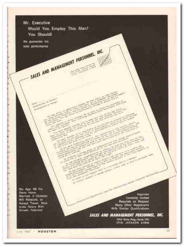 Original 1967 Houston business trade magazine vintage ad for SALES AND MANAGEMENT PERSONNEL, INC. Main office was located at 3701 Kirby Bldg., Suite 750, Houston, Texas. Mr. Executive, would you employ this man? We guarantee his total performance. Evaluations, Selection, Testing, Recruiting, Sales Training and Motivation. Employment agency. This old dated one page magazine advertisement would display beautifully matted and framed.
