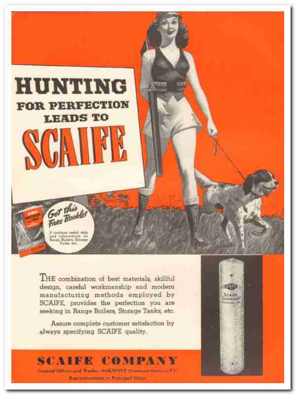 Original vintage magazine ad for SCAIFE COMPANY range boilers, storage tanks, plumbing supplies manufactured. Hunting for perfection. Main office located in Oakmont, Pittsburgh, PA.